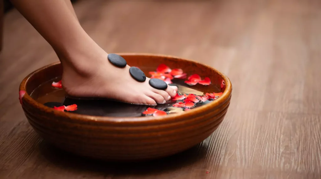 A pedicure designed for clients with diabetes or those with very dry feet and wanting a good foot soaking and exfoliation. First we gently buff that dry skin, then your feet are submerged into a warm, hydrating jet bath to soften them. Next, using our special exfoliating products, dead dry skin is removed and a stimulating, moisturizing foot and leg massage is performed. Finally the polish of your choice is applied.
